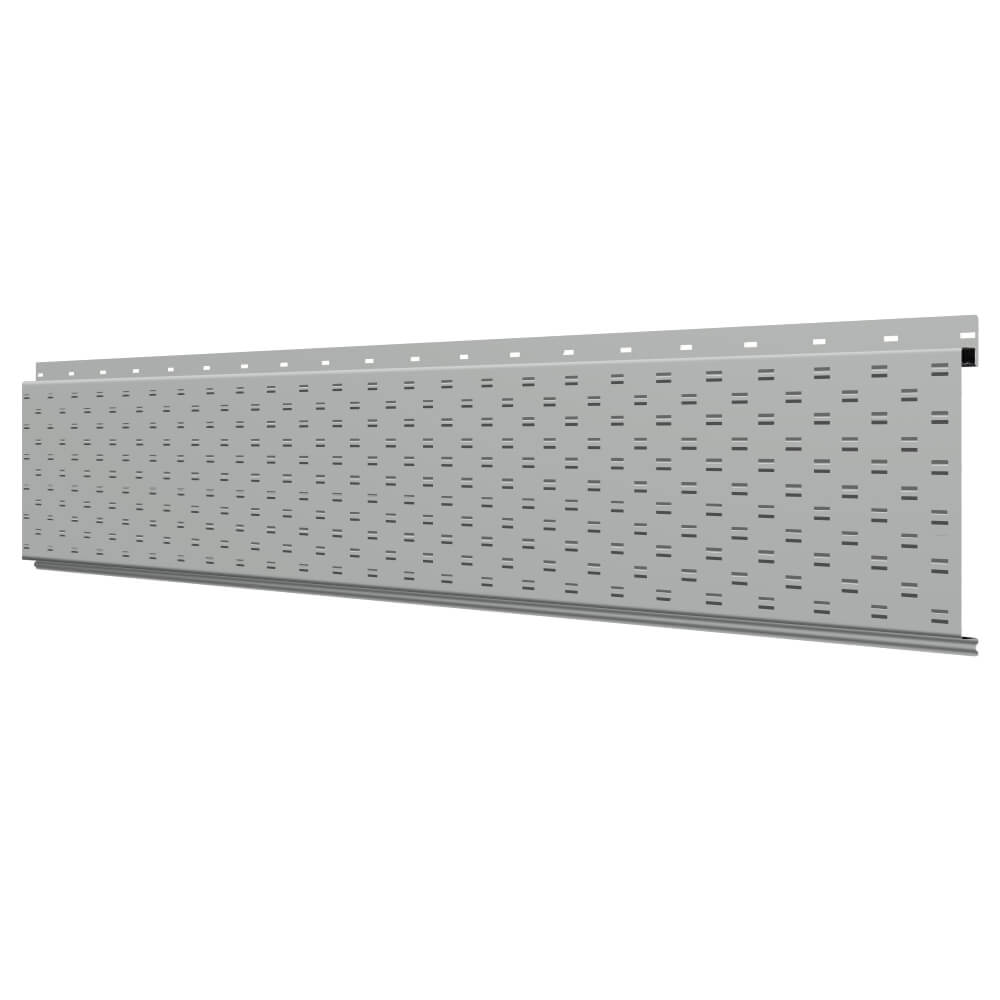 Линеарная потолочно-стеновая панель с ПЕРФОРАЦИЕЙ для вентиляции цвет RAL9006 Серебро применяется в качестве софитов для подшивы крыши, наружной и внутренней отделки потолков, стен, фронтонов фасада дома в Сыктывкаре.