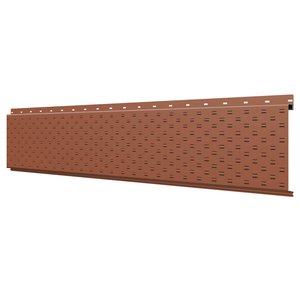 Линеарная потолочно-стеновая панель с ПЕРФОРАЦИЕЙ для вентиляции цвет RAL8004 Терракотовый применяется в качестве софитов для подшивы крыши, наружной и внутренней отделки потолков, стен, фронтонов фасада дома в Сыктывкаре.