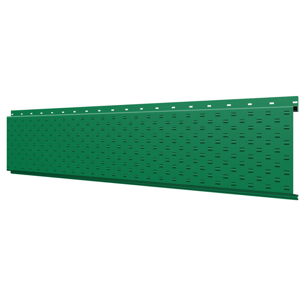 Линеарная потолочно-стеновая панель с ПЕРФОРАЦИЕЙ для вентиляции цвет RAL6029 Зеленая Мята применяется в качестве софитов для подшивы крыши, наружной и внутренней отделки потолков, стен, фронтонов фасада дома в Сыктывкаре.