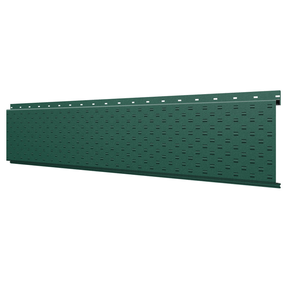 Линеарная потолочно-стеновая панель с ПЕРФОРАЦИЕЙ для вентиляции цвет RAL6005 Зеленый Мох Стальной Бархат применяется в качестве софитов для подшивы крыши, наружной и внутренней отделки потолков, стен, фронтонов фасада дома в Сыктывкаре.