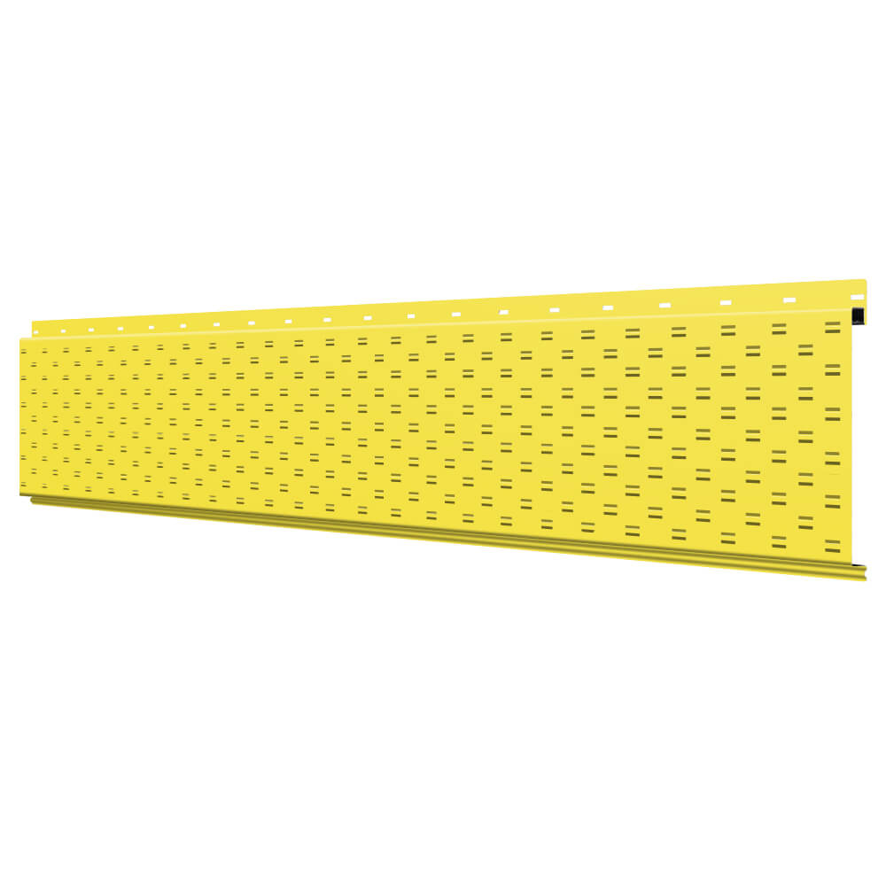 Линеарная потолочно-стеновая панель с ПЕРФОРАЦИЕЙ для вентиляции цвет RAL1018 Желтый применяется в качестве софитов для подшивы крыши, наружной и внутренней отделки потолков, стен, фронтонов фасада дома в Сыктывкаре.