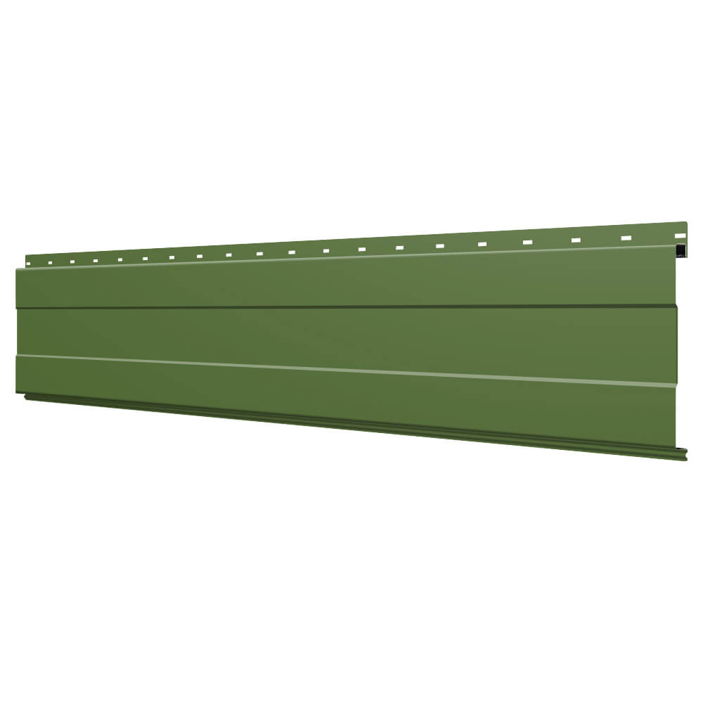 Линеарная потолочно-стеновая панель с ПОЛОСОЙ усиленная цвет RAL6002 Зеленый Лист применяется в качестве софитов для подшивы крыши, наружной и внутренней отделки потолков, стен, фронтонов фасада дома в Сыктывкаре.
