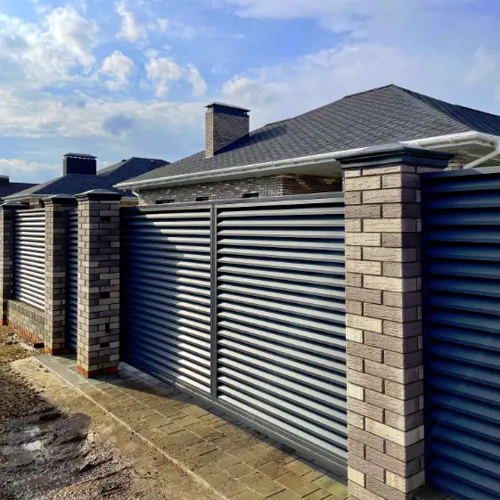 Представляем готовый объект, в котором гармонично сочетаются современные композитные материалы и стильные стальные решения: на столбах кирпичного забора установлен полимерпесчаный колпак из коллекции Monblan, в элегантном сером оттенке. Прочность колпака из полимерно-песчаного композита обеспечивает надежную защиту кладки от внешних воздействий и придает конструкции завершенный вид. Сам забор выполнен в жалюзийном исполнении с изящными ламелями ЭКО-Z МАТТЕ в цвете Серый Графит с матовым двусторонним полиэстеровым покрытием, что подчеркивает современный стиль ограждения и обеспечивает его долговечность. В целом объект выглядит гармонично и надежно, создавая эстетичное и практичное решение для оформления участка.